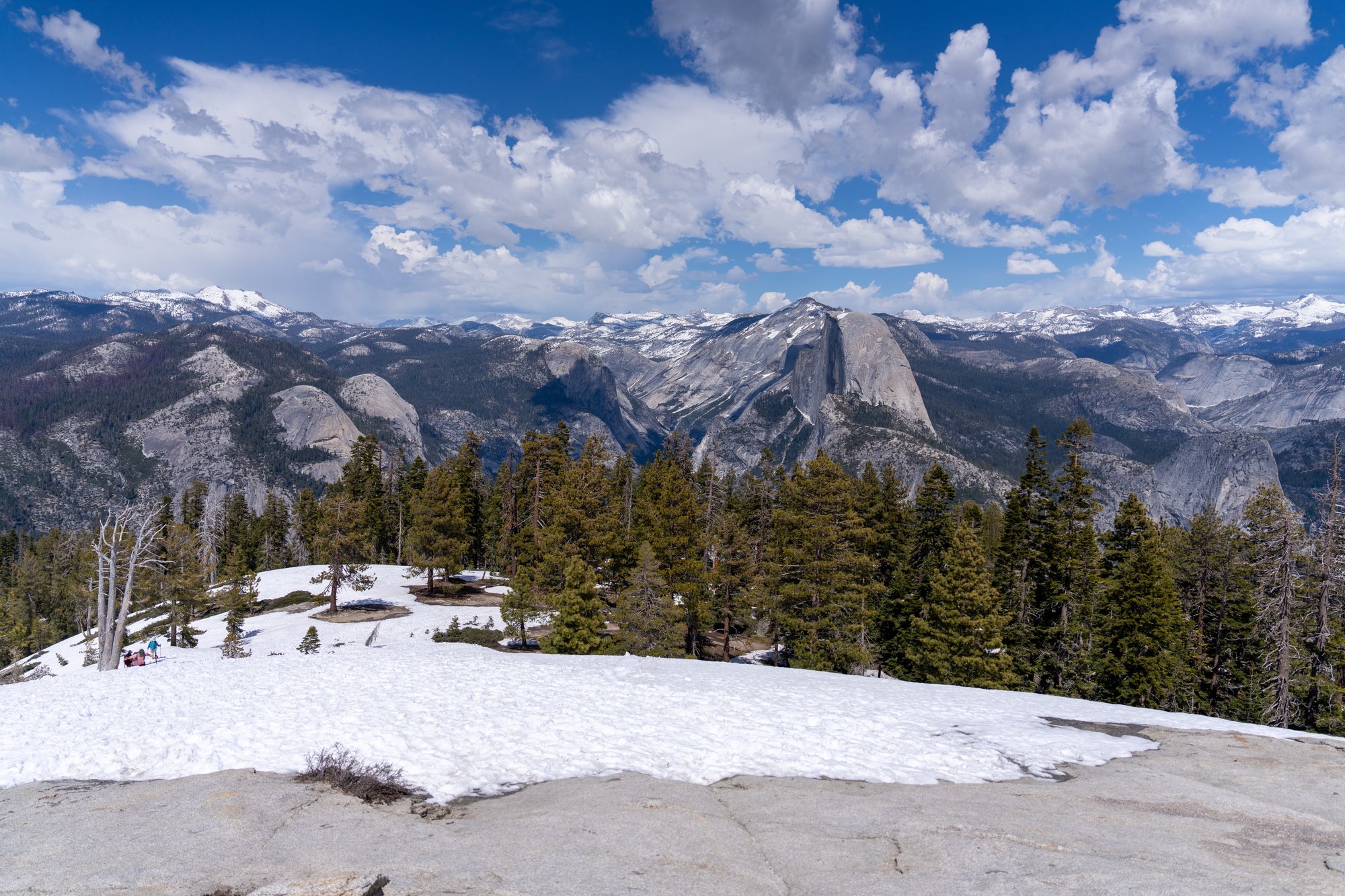 Het is maar 1,7 kilometer lopen tot Sentinel Dome, maar door de stukjes sneeuw op het pad gaat het toch niet heel snel. Als we eenmaal bij Sentinel Dome aankomen, zien we dat deze berg nog bedekt is onder een dikke laag sneeuw. En behoorlijk steil is. Gelukkig hebben we onze wandelstokken bij voor extra balans. Voetje voor voetje klimmen we omhoog en daar worden we beloond met een prachtig uitzicht. We kijken over de gehele vallei en zien El Capitan, de Yosemite Falls, Half Dome, de Vernal Fall en de Nevada Fall. Alles in één uitzicht. Dat was het gedoe dan toch wel waard!