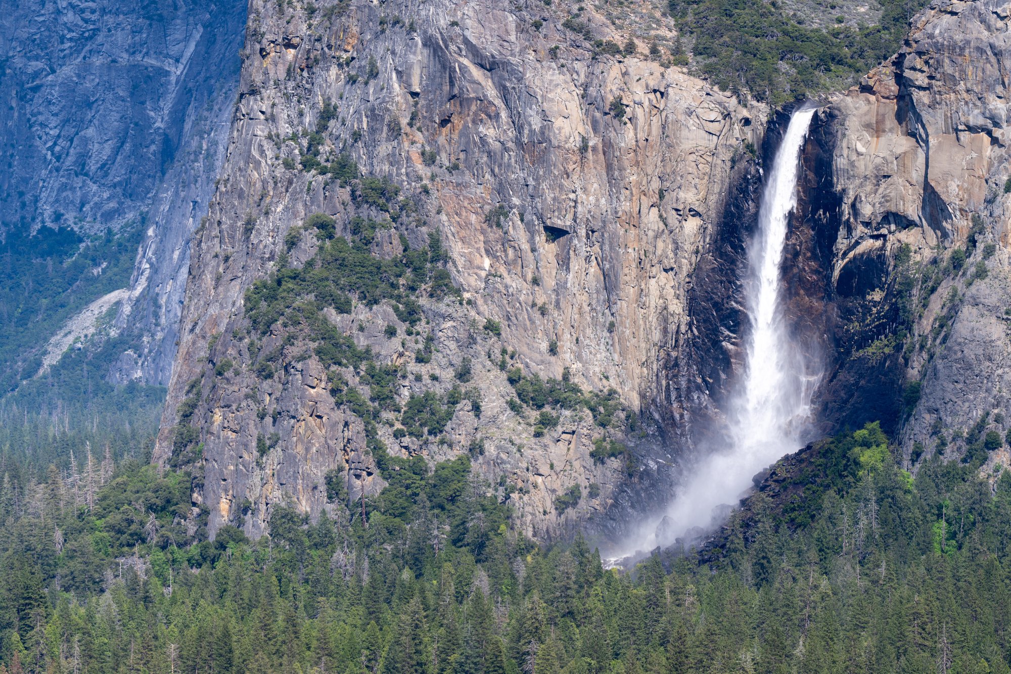 We stoppen als eerste bij de Bridal Veil Falls. Dit is een waterval die je al makkelijk van een afstand kunt zien, want de waterval is 188 meter hoog. Een leuke kennismaking met Yosemite!